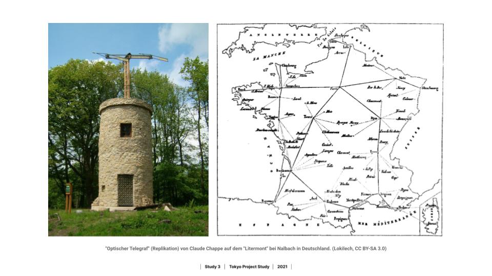 これは何だか分かりますか?と画面に映し出されたのは石造りの古風な建物。1700年代、ナポレオン時代に発明された「腕木通信」と呼ばれる人力のインターネットだ。塔に設置されたレバーを回すことで手旗信号を発信し、遠方にある塔から双眼鏡でメッセージを受信(読解)する。1700年代以前にも狼煙などのコミュニケーションツールがあったが、「記号」を用いたバケツリレー方式で情報通信する最初の装置。それまで馬を走らせて情報を伝えていたのに比べ、1分間に80km先の情報をキャッチできるようになり、ナポレオンは戦いを制していったともいわれている。